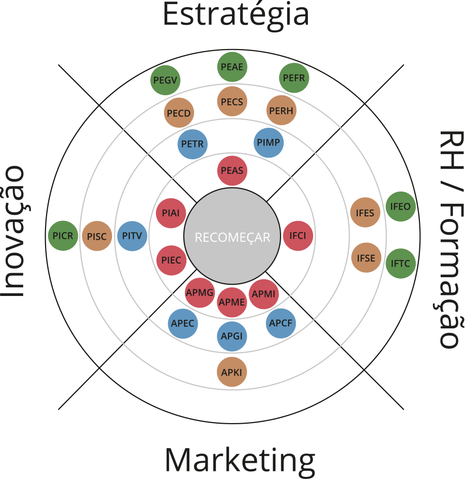 Na base da estratégia Recomeçar, observamos os projetos que estão a ser implementados em quatro áreas de intervenção: Estratégia, Inovação, Marketing e Formação.